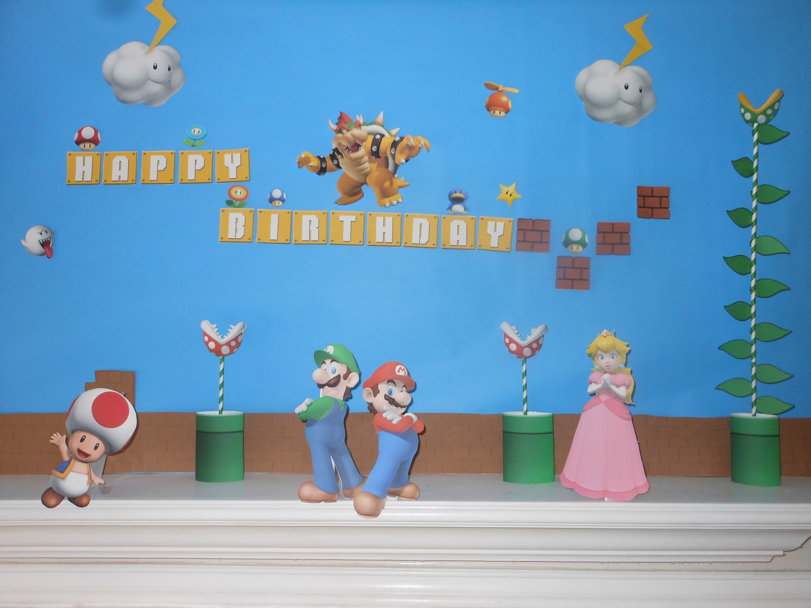 I made this Super Mario backdrop for the party that went over the fireplace.